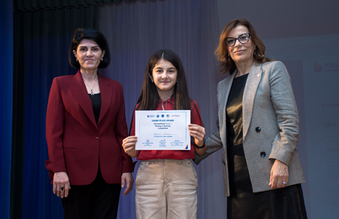 Science Fair, November 03, 2021, Baku, Azerbaijan. From left to right: Nazpari Bayeamova (Director of Dunya School, Baku, Azerbaijan), Zeynab Kazimli (Dunya School, Baku, Azerbaijan), and Irada Khalilova (Rector of Khazar University, Baku, Azerbaijan).